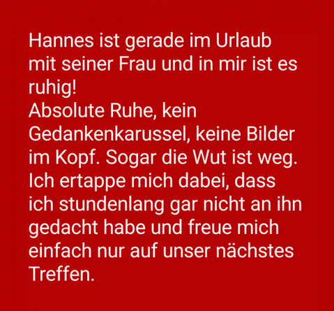 Also kamen wir darin überein, durchzuhalten, den Weg auf diese Art miteinander zu gehen. Was allerdings in der Theorie so machbar klang, war dennoch fast unmöglich. Meine Werte, Eifersucht, Verlustangst, Neidgefühle, Hilflosigkeit, ja sogar Ohnmacht waren so überwältigend, dass Streit und Eskalation mindestens genauso oft unseren Alltag bestimmten, wie wunderschöne Treffen und Zeit miteinander. Mir ging es schlecht und er hatte ein unfassbar schlechtes Gewissen und Schuldgefühle mir gegenüber.